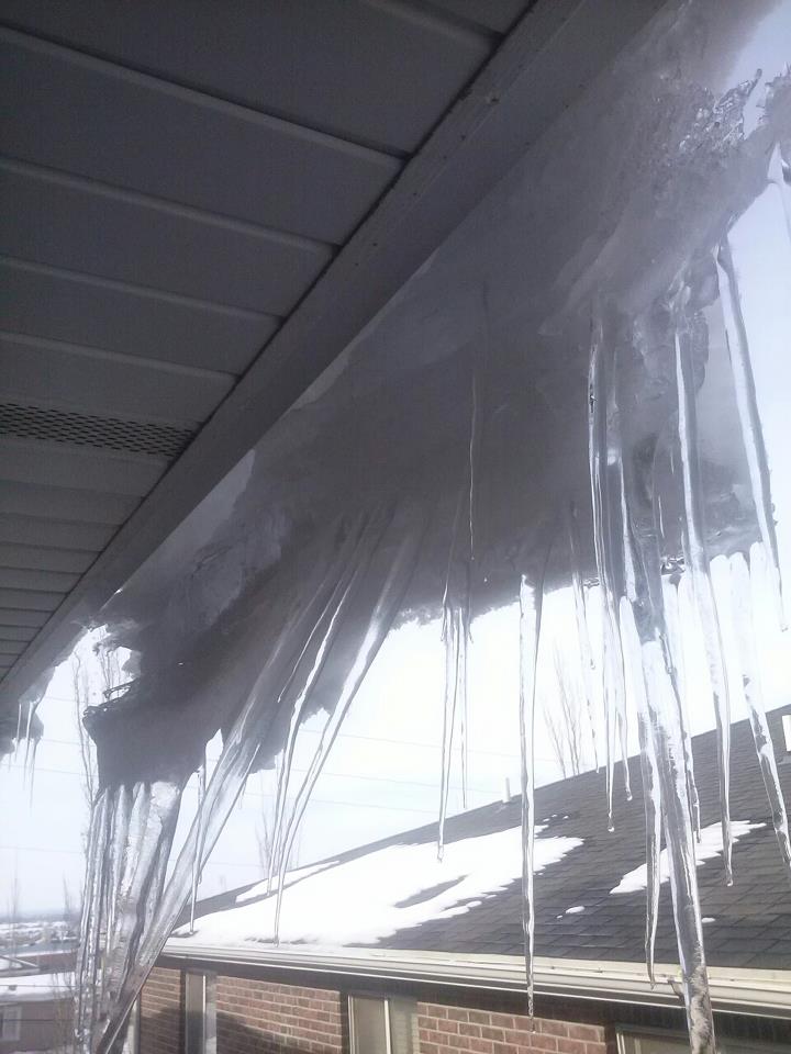 Isn’t it funny how once you learn something new or are exposed to something fresh and different, that you start to notice that particular fact or thing or word in places that you never previously considered? Yesterday one of our friends who just recently learned about what we do at Sno Shield, e-mailed us this picture (below) of sliding ice and snow outside his window, with a caption along the lines of “saw this and thought of you.” We’ve had employees in the past too who had started to notice the same kinds of snow and ice dangers on roofs on just about every street they passed after starting working for us.